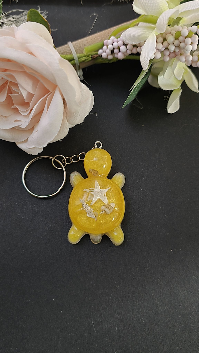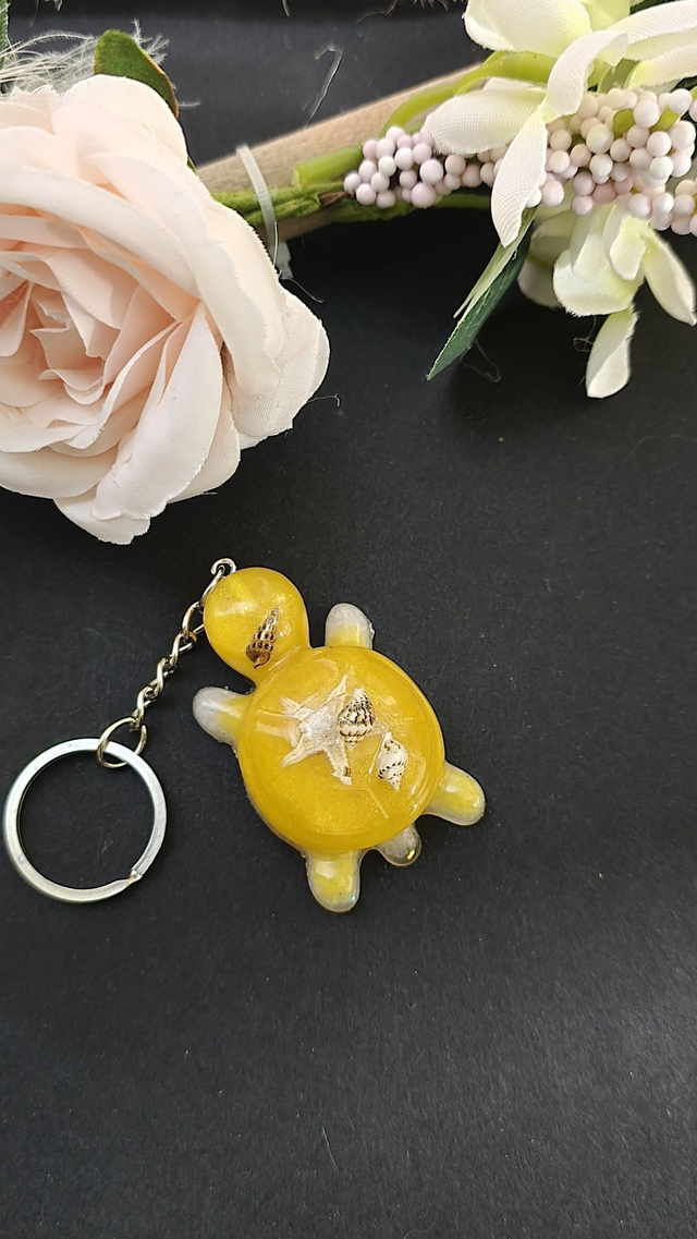Portes clés tortue jaune avec différentes finition ( Coquillages, Fleurs etc...)